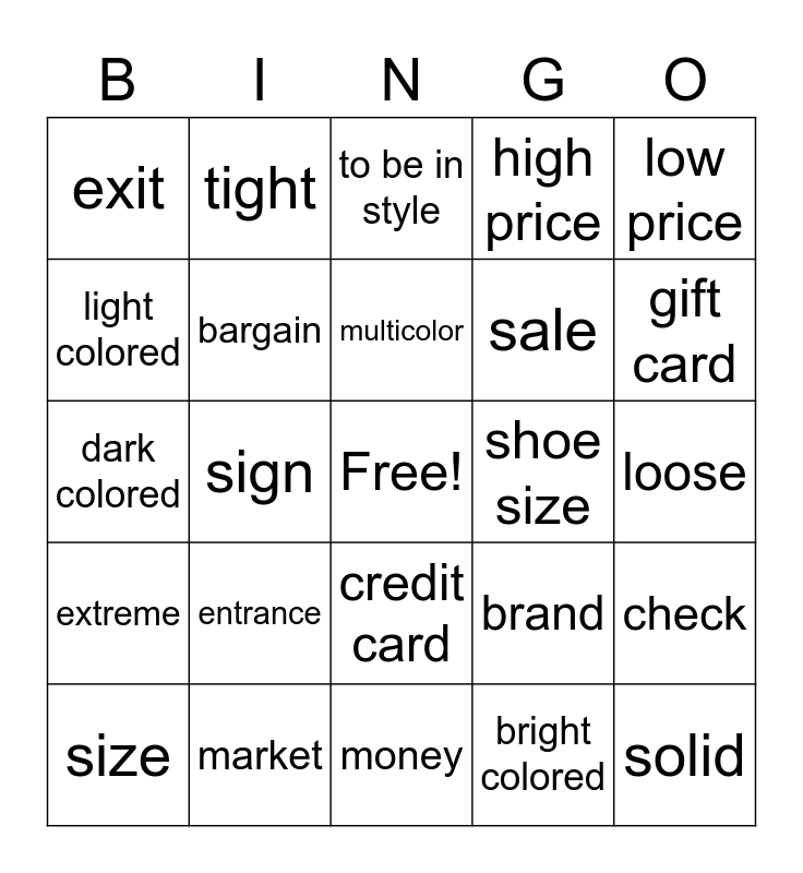 This bingo card has a free space and 24 words: entrance, market, multicolor, size, low price, exit, light colored, tight, shoe size, credit card, sale, dark colored, brand, check, bargain, bright colored, loose, to be in style, gift card, sign, solid, extreme, high price and money.