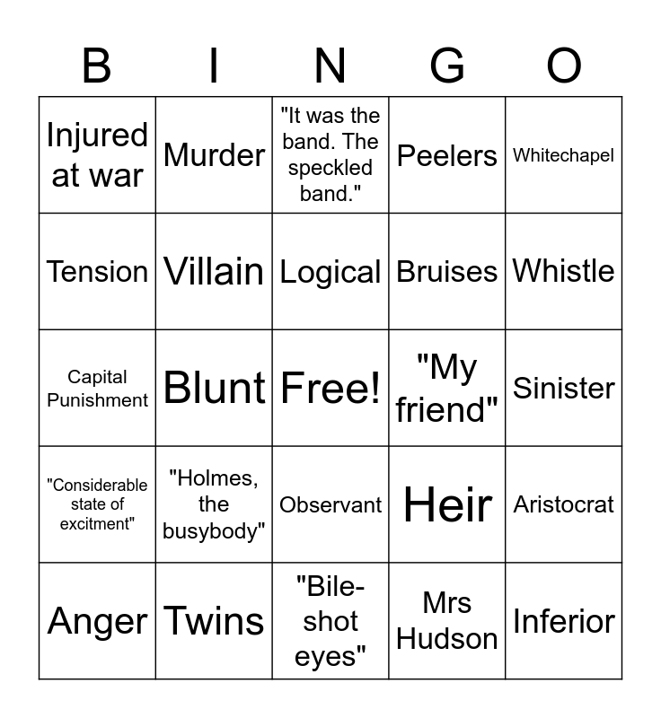 This bingo card has a free space and 35 words: Baker, Unusual, fantastic, She was grieving, Villain, Observant, Peelers, Tension, Red herrings, Logical, Interesting and unusual detective, Capital Punishment, Whitechapel, Surgeon, Arthur Conan Doyle, Injured at war, "My friend", Mrs Hudson, Blunt, "Considerable state of excitment", Inferior, Heir, Anger, Aristocrat, Twins, "It was the band. The speckled band.", Whistle, Covulsion, Suspense, Bruises, Sinister, Villain, "Bile-shot eyes", "Holmes, the busybody", Murder and Innocent.