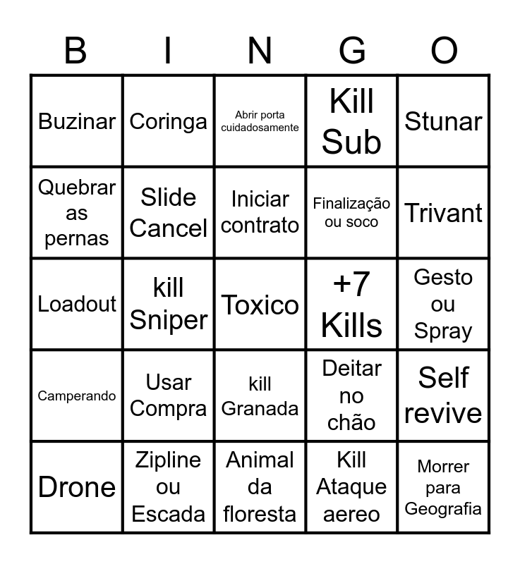 This bingo card has 40 words: Kill AR, Loadout, Veiculo, Slide Cancel, Zipline ou Escada, kill Granada, Iniciar contrato, Caixa muniçao ou placas, Stunar, Camperando, kill Sniper, Kill Sub, Toxico, Gesto ou Spray, +7 Kills, Usar Compra, Vant (UAV), Buzinar, Abrir Paraquedas, Abrir porta cuidadosamente, Self revive, Kill Ataque aereo, Finalização ou soco, Quebrar as pernas, Mascara de gas, Dead silence, Encontrar Xitao, Exotico, Morrer para Geografia, Parkour, Ganhar a partida, Drone, Matar/Morrer atropelado, Deitar no chão, Trivant, Animal da floresta, Perks Novos, Pingou algo, Coringa and Kuringa.
