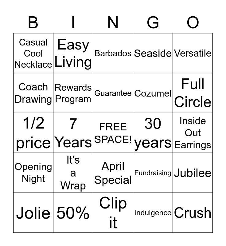 This bingo card has a free space and 24 words: It's a Wrap, 50%, Guarantee, Jolie, Versatile, Casual Cool Necklace, Coach Drawing, Easy Living, 30 years, April Special, Cozumel, 1/2 price, Fundraising, Jubilee, Rewards Program, Indulgence, Inside Out Earrings, Barbados, Full Circle, 7 Years, Crush, Opening Night, Seaside and Clip it.