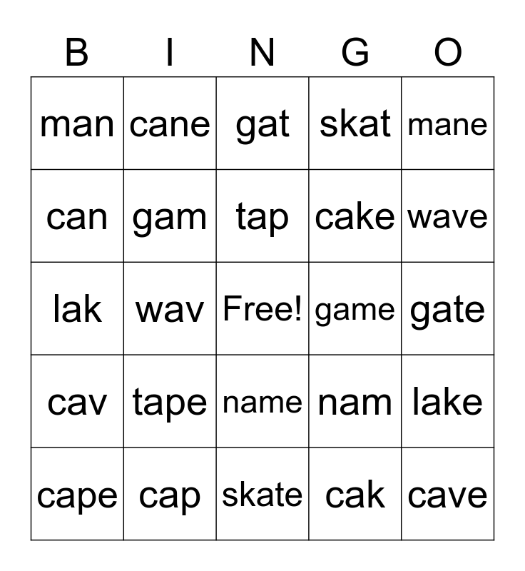 This bingo card has a free space and 24 words: tape, cap, tap, cape, mane, man, can, cane, game, name, cake, lak, nam, lake, gam, cak, gate, gat, wave, wav, cave, cav, skat and skate.