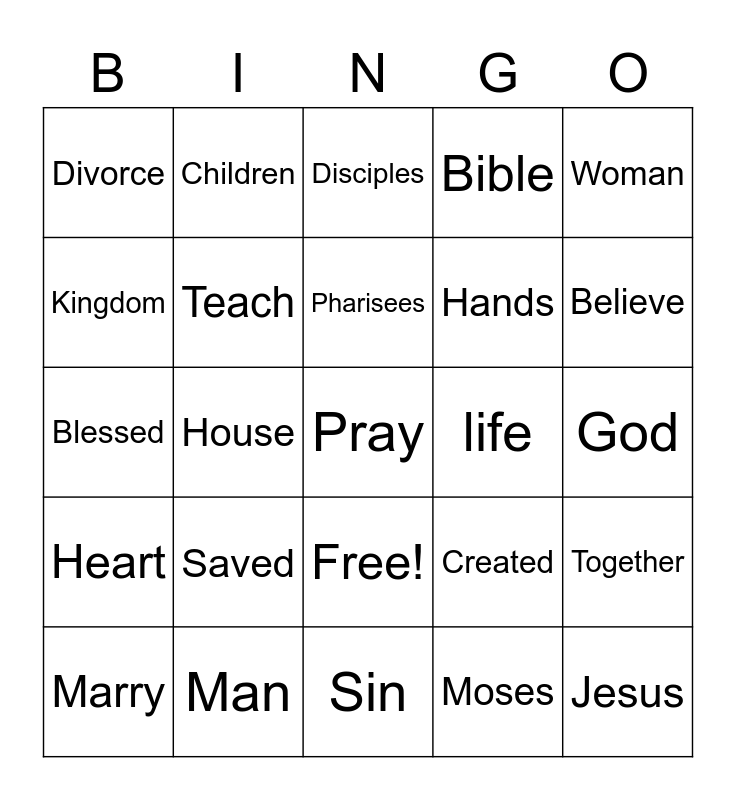 This bingo card has 26 words: Free!, Moses, Pharisees, Man, Woman, Divorce, Kingdom, Children, God, Created, Hands, Blessed, Together, Marry, House, Faith, Bible, Heart, Disciples, Pray, Believe, Sin, life, Saved, Teach and Jesus.