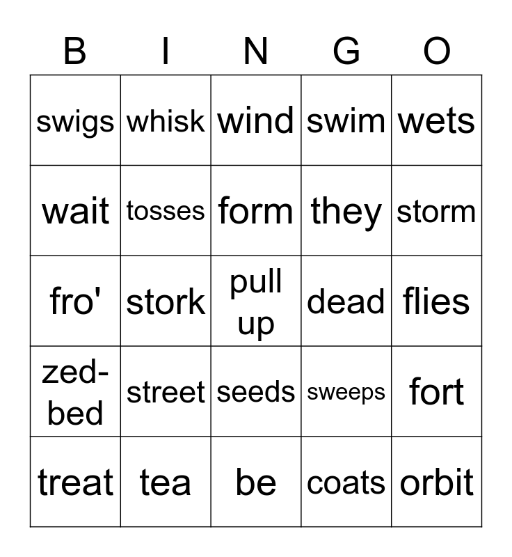 This bingo card has a free space and 24 words: street, tea, form, treat, wets, swigs, wait, whisk, dead, seeds, they, fro', sweeps, fort, tosses, coats, flies, wind, storm, stork, orbit, zed-bed, swim and be.