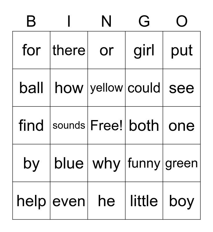 This bingo card has a free space and 24 words: blue, even, yellow, help, put, for, ball, there, both, why, could, find, funny, green, how, little, one, or, see, sounds, boy, by, girl and he.