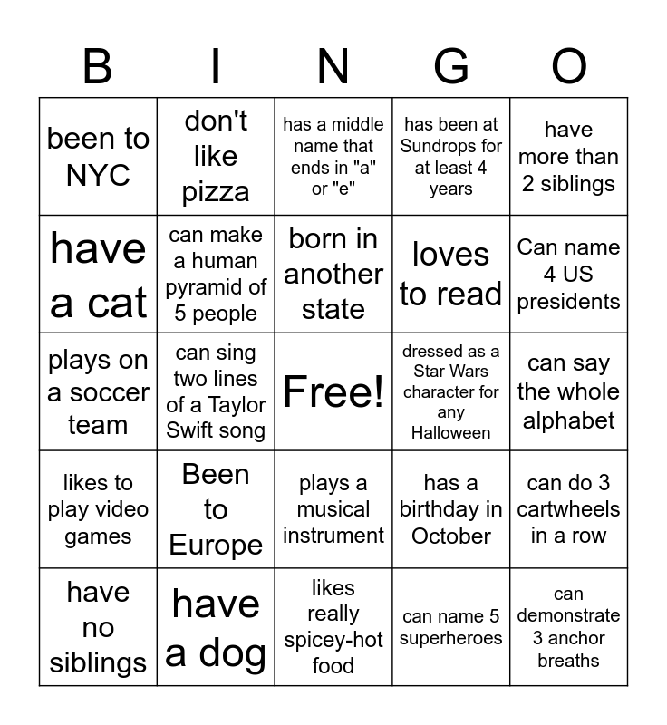 This bingo card has a free space and 24 words: Been to Europe, have a dog, born in another state, have no siblings, have more than 2 siblings, been to NYC, have a cat, don't like pizza, dressed as a Star Wars character for any Halloween, plays a musical instrument, loves to read, plays on a soccer team, has a birthday in October, can do 3 cartwheels in a row, can make a human pyramid of 5 people, can name 5 superheroes, can say the whole alphabet, has a middle name that ends in "a" or "e", Can name 4 US presidents, can sing two lines of a Taylor Swift song, can demonstrate 3 anchor breaths, likes to play video games, has been at Sundrops for at least 4 years and likes really spicey-hot food.