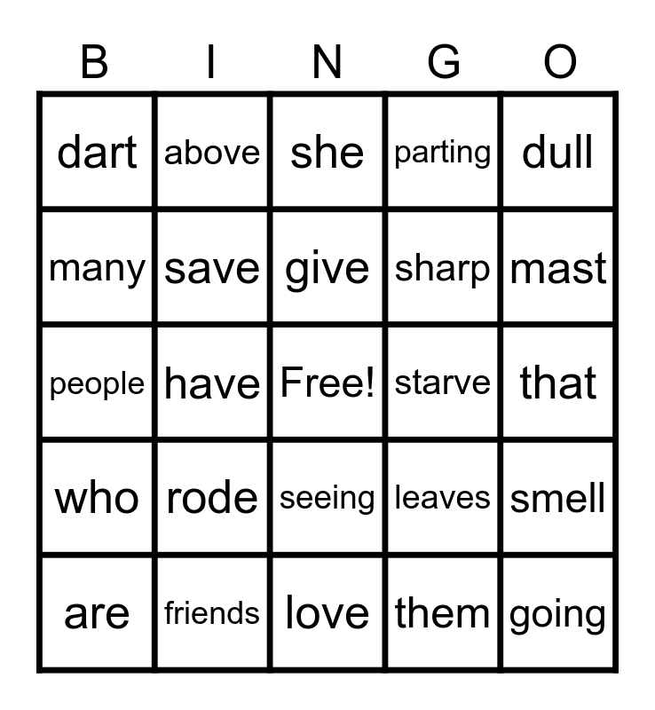 This bingo card has a free space and 24 words: rode, friends, give, are, dull, dart, many, above, starve, seeing, sharp, people, leaves, smell, save, them, that, she, mast, have, going, who, parting and love.