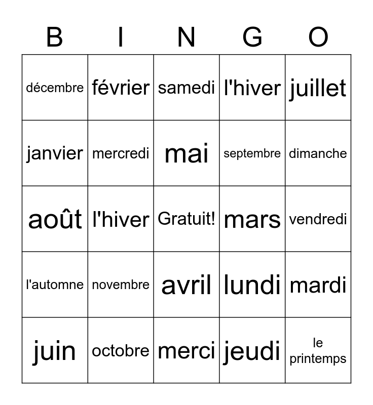 This bingo card has a free space and 24 words: novembre, octobre, mai, juin, juillet, décembre, janvier, février, mars, avril, septembre, août, lundi, mardi, mercredi, jeudi, vendredi, samedi, dimanche, l'hiver, le printemps, l'automne, l'hiver and merci.