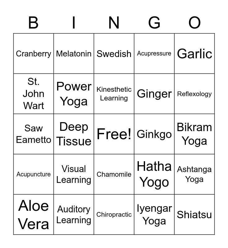 This bingo card has a free space and 24 words: Visual Learning, Auditory Learning, Kinesthetic Learning, Aloe Vera, Garlic, Cranberry, St. John Wart, Melatonin, Ginkgo, Chamomile, Ginger, Saw Eametto, Hatha Yogo, Ashtanga Yoga, Power Yoga, Iyengar Yoga, Bikram Yoga, Swedish, Reflexology, Deep Tissue, Shiatsu, Acupuncture, Acupressure and Chiropractic.