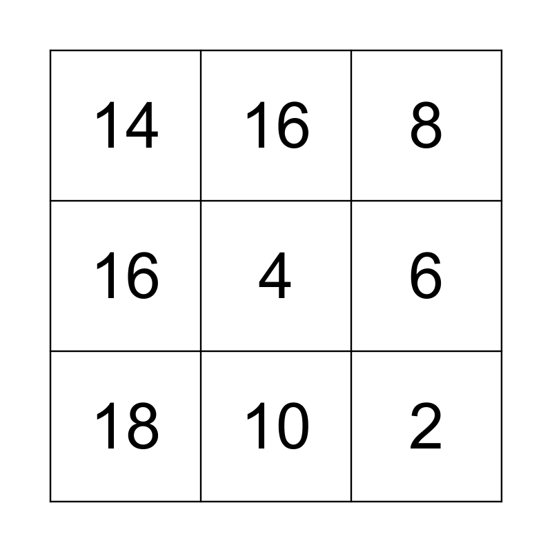 This bingo card has 12 words: 18, 2, 4, 6, 16, 8, 10, 12, 14, 16, 18 and 20.