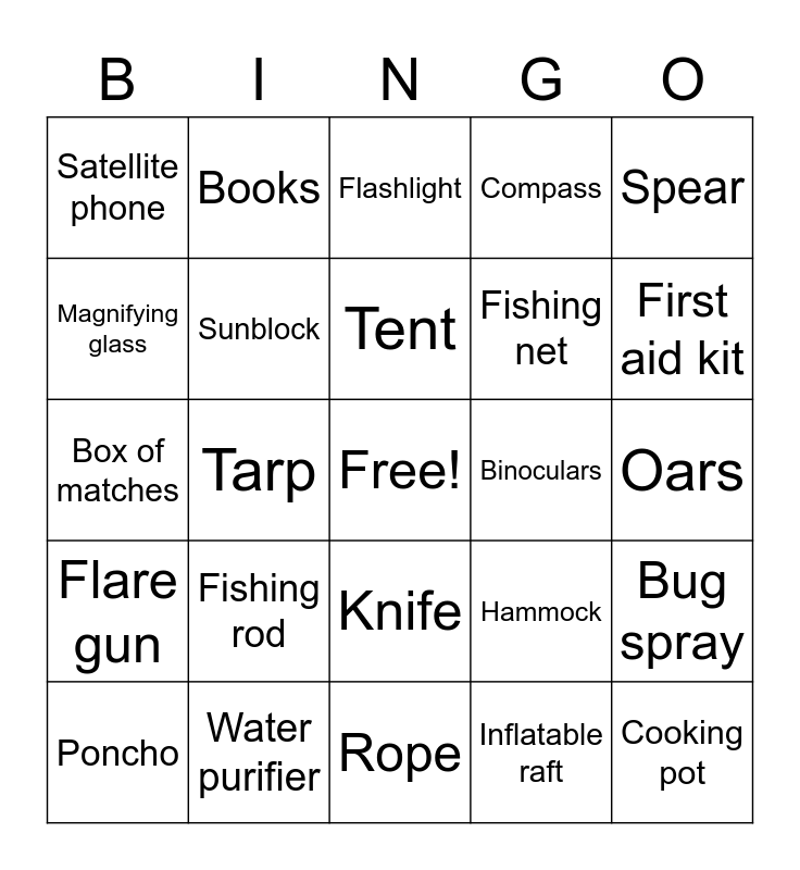 This bingo card has a free space and 24 words: Fishing rod, Water purifier, Tent, Poncho, Spear, Satellite phone, Magnifying glass, Books, Binoculars, Knife, Fishing net, Box of matches, Hammock, Bug spray, Sunblock, Inflatable raft, Oars, Flashlight, First aid kit, Tarp, Cooking pot, Flare gun, Compass and Rope.