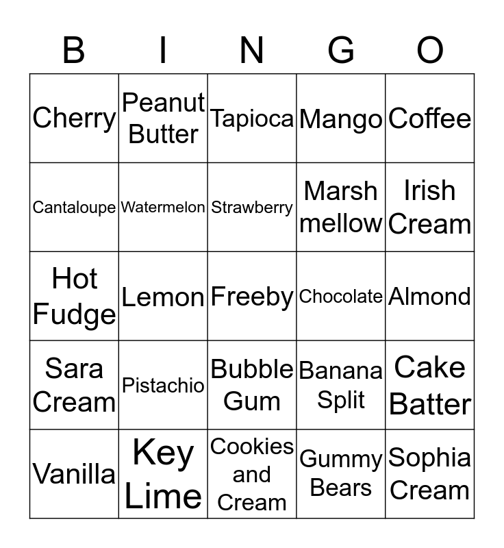 This bingo card has a free space and 24 words: Pistachio, Key Lime, Strawberry, Vanilla, Coffee, Cherry, Cantaloupe, Peanut Butter, Chocolate, Bubble Gum, Marsh mellow, Hot Fudge, Banana Split, Cake Batter, Watermelon, Gummy Bears, Almond, Tapioca, Irish Cream, Lemon, Sophia Cream, Sara Cream, Mango and Cookies and Cream.