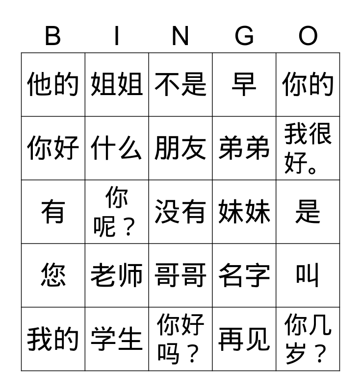 This bingo card has a free space and 24 words: 老师, 学生, 朋友, 我的, 你的, 他的, 你好, 姐姐, 妹妹, 哥哥, 弟弟, 有, 名字, 叫, 什么, 再见, 是, 不是, 我很好。, 你呢?, 你几岁?, 您, 早 and 你好吗?.