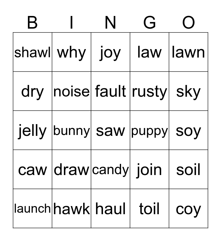 This bingo card has 25 words: draw, haul, fault, launch, lawn, shawl, dry, why, puppy, candy, rusty, jelly, join, soil, noise, coy, soy, joy, sky, bunny, saw, hawk, caw, law and toil.