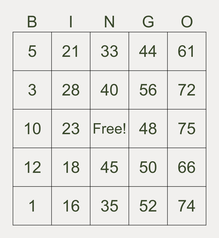 This bingo card has a free space and 24 words: 1, 18, 40, 52, 61, 5, 21, 33, 48, 75, 10, 28, 50, 66, 3, 16, 35, 44, 72, 12, 23, 45, 56 and 74.