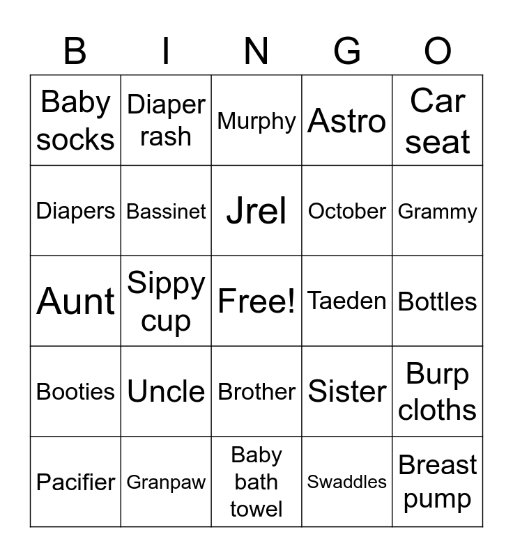 This bingo card has a free space and 33 words: Baby wash, Onsies, Sippy cup, Baby bath, Booties, Bassinet, Car seat, Pacifier, Diaper rash, Crib sheets, Jrel, Murphy, Adam, Jordan, Taeden, Grammy, Granpaw, Aunt, Uncle, Sister, Brother, Diaper bag, Baby socks, Bottles, Baby bath towel, Breast pump, Astro, October, Diapers, Burp cloths, Stuff animal, Swaddles and Toys.