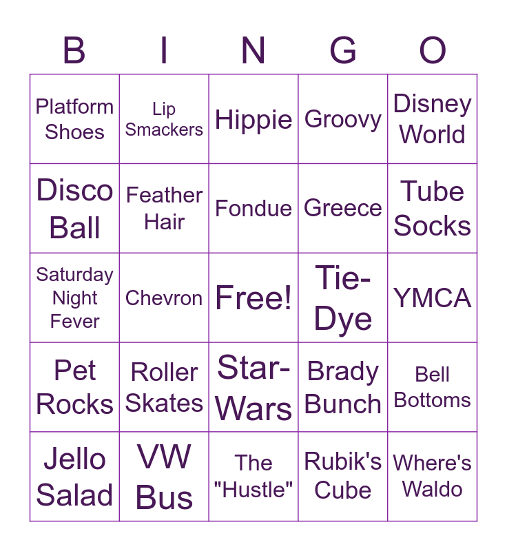 This bingo card has a free space and 24 words: Roller Skates, VW Bus, Fondue, Jello Salad, Disney World, Platform Shoes, Disco Ball, Lip Smackers, Tie- Dye, Star-Wars, Greece, Saturday Night Fever, Brady Bunch, Bell Bottoms, Feather Hair, Rubik's Cube, YMCA, Hippie, Tube Socks, Chevron, Where's Waldo, Pet Rocks, Groovy and The "Hustle".