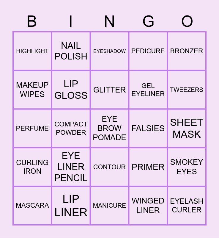This bingo card has 30 words: MASCARA, BEAUTY BLENDER, GLITTER, BLUSH, BRONZER, HIGHLIGHT, NAIL POLISH, CONTOUR, FALSIES, EYELASH CURLER, CURLING IRON, LIP GLOSS, SETTING SPRAY, WINGED LINER, SMOKEY EYES, FOUNDATION, COMPACT POWDER, EYE BROW POMADE, PRIMER, TWEEZERS, PERFUME, LIP LINER, EYESHADOW, GEL EYELINER, SHEET MASK, MAKEUP WIPES, EYE LINER PENCIL, MANICURE, PEDICURE and STRAIGHTENER.