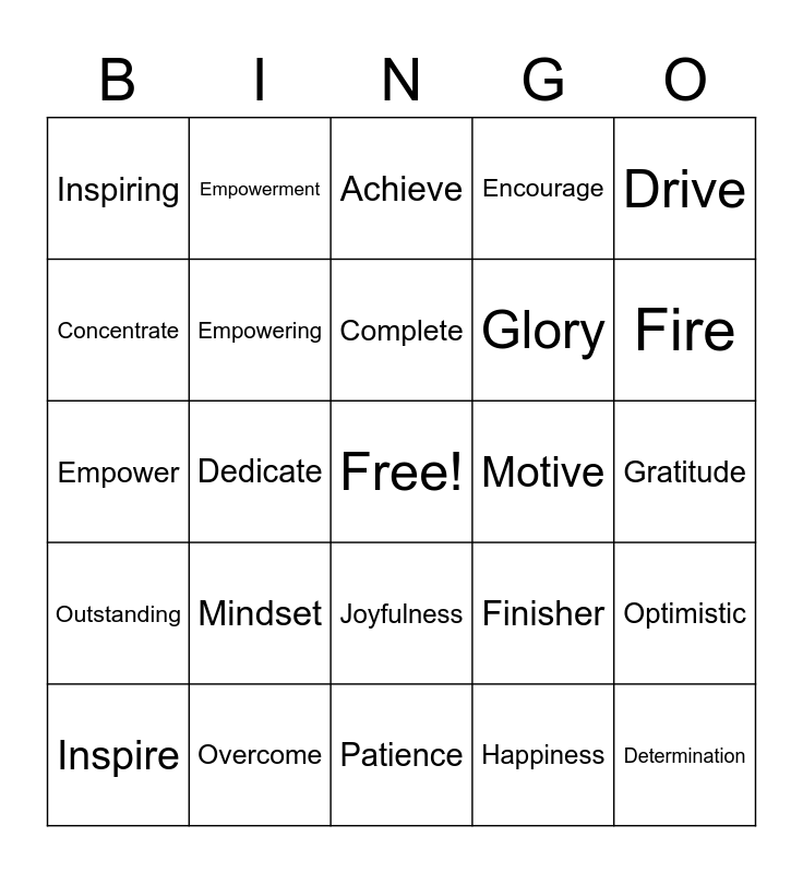 This bingo card has a free space and 75 words: Accomplish, Accomplishments, Achieve, Action, Adventure, Beauty, Believe, Build, Catalyst, Challenge, Commit, Compassion, Complete, Concentrate, Dare, Dedicate, Dedication, Determination, Determine, Drive, Earnest, Empower, Empowering, Empowerment, Encourage, Encouragement, Encouraging, Endurance, Faith, Faithful, Faithfulness, Fearless, Fighter, Finisher, Fire, Glory, Goal, Goodness, Gratitude, Happiness, Honesty, Honor, Hope, Improve, Initiative, Inspiration, Inspire, Inspiring, Integrity, Joy, Joyful, Joyfulness, Kind, Kindness, Knowledge, Lead, Leading, Learn, Life, Limitless, Mindset, Momentum, Motivate, Motivated, Motivation, Motive, Now, Obstacles, Opportunity, Optimistic, Outstanding, Overcome, Passion, Patience and Willpower.