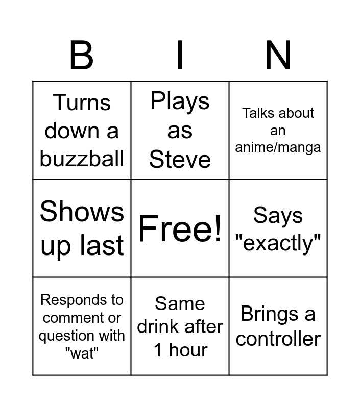 This bingo card has a free space and 8 words: Says "exactly", Talks about an anime/manga, Plays as Steve, Responds to comment or question with "wat", Turns down a buzzball, Brings a controller, Shows up last and Same drink after 1 hour.