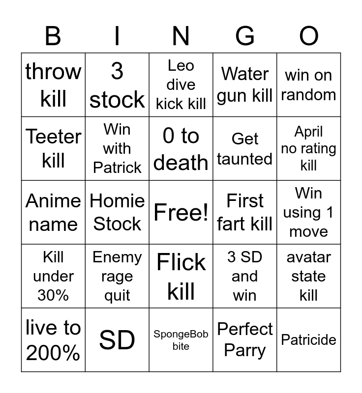 This bingo card has a free space and 24 words: Enemy rage quit, SD, 0 to death, live to 200%, win on random, throw kill, Teeter kill, 3 stock, First fart kill, Flick kill, Get taunted, Anime name, 3 SD and win, avatar state kill, Win with Patrick, Perfect Parry, Win using 1 move, Leo dive kick kill, April no rating kill, Homie Stock, Patricide, Kill under 30%, Water gun kill and SpongeBob bite.