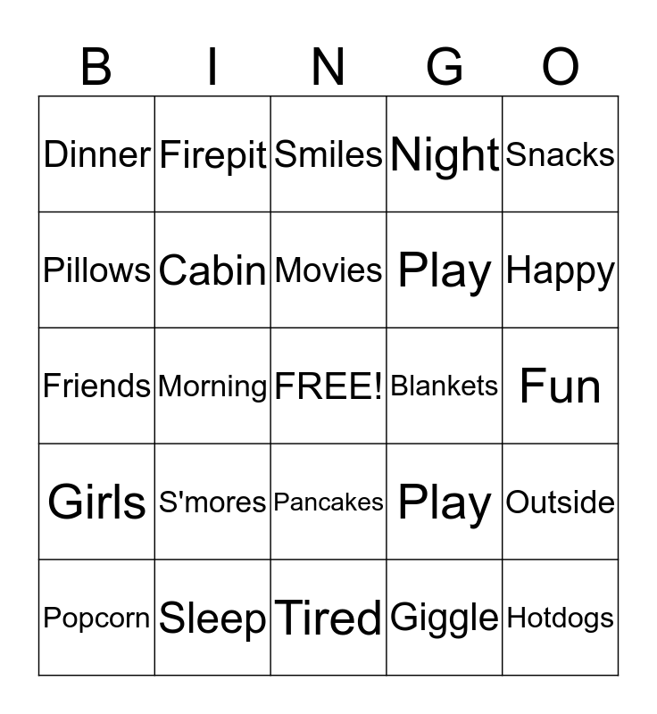 This bingo card has a free space and 24 words: S'mores, Sleep, Movies, Popcorn, Snacks, Dinner, Pillows, Firepit, Blankets, Pancakes, Play, Friends, Play, Outside, Cabin, Giggle, Fun, Smiles, Happy, Morning, Hotdogs, Girls, Night and Tired.
