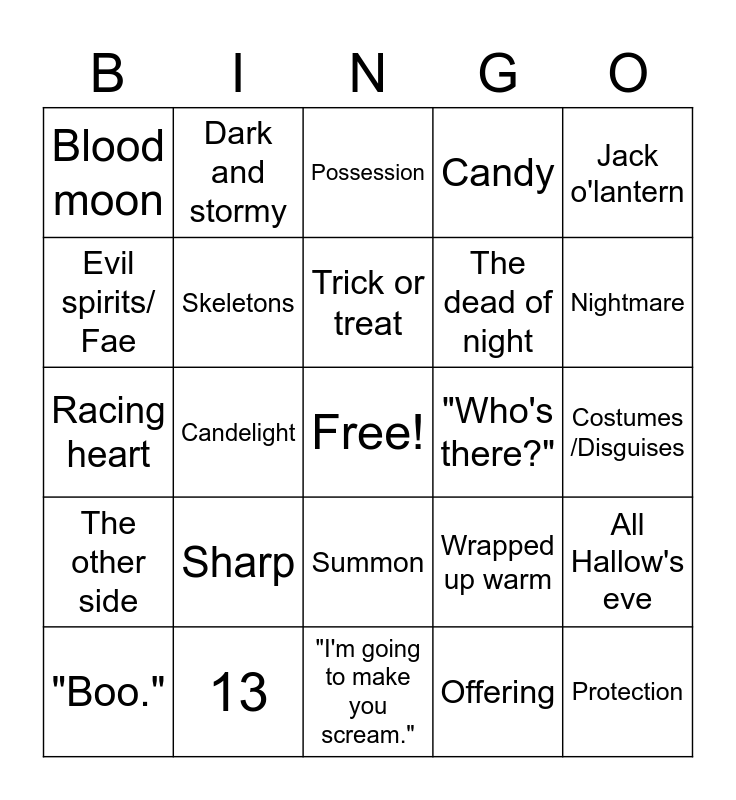 This bingo card has a free space and 24 words: "Boo.", Sharp, Trick or treat, Offering, Jack o'lantern, Blood moon, Dark and stormy, Possession, "Who's there?", Costumes /Disguises, Racing heart, Skeletons, Wrapped up warm, All Hallow's eve, Evil spirits/ Fae, 13, "I'm going to make you scream.", Candy, Nightmare, The other side, Candelight, Summon, The dead of night and Protection.