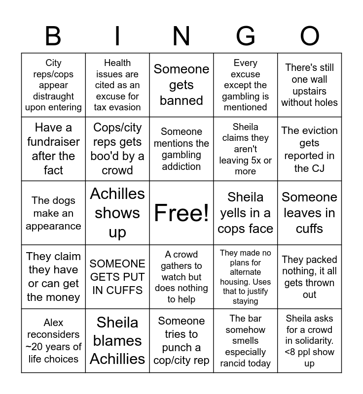 This bingo card has a free space and 24 words: SOMEONE GETS PUT IN CUFFS, Sheila blames Achillies, Someone mentions the gambling addiction, Alex reconsiders ~20 years of life choices, There's still one wall upstairs without holes, City reps/cops appear distraught upon entering, Have a fundraiser after the fact, Health issues are cited as an excuse for tax evasion, Sheila yells in a cops face, A crowd gathers to watch but does nothing to help, Sheila claims they aren't leaving 5x or more, The dogs make an appearance, They made no plans for alternate housing. Uses that to justify staying, They packed nothing, it all gets thrown out, Cops/city reps gets boo'd by a crowd, The bar somehow smells especially rancid today, Someone leaves in cuffs, Someone gets banned, The eviction gets reported in the CJ, Achilles shows up, Sheila asks for a crowd in solidarity. <8 ppl show up, They claim they have or can get the money, Every excuse except the gambling is mentioned and Someone tries to punch a cop/city rep.