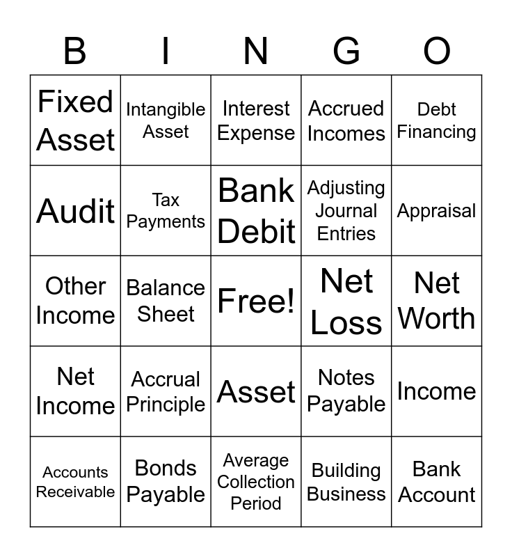 This bingo card has a free space and 24 words: Accounts Receivable, Accrual Principle, Bank Debit, Building Business, Debt Financing, Fixed Asset, Intangible Asset, Interest Expense, Net Loss, Net Worth, Other Income, Tax Payments, Notes Payable, Income, Audit, Bonds Payable, Average Collection Period, Accrued Incomes, Appraisal, Net Income, Balance Sheet, Asset, Adjusting Journal Entries and Bank Account.