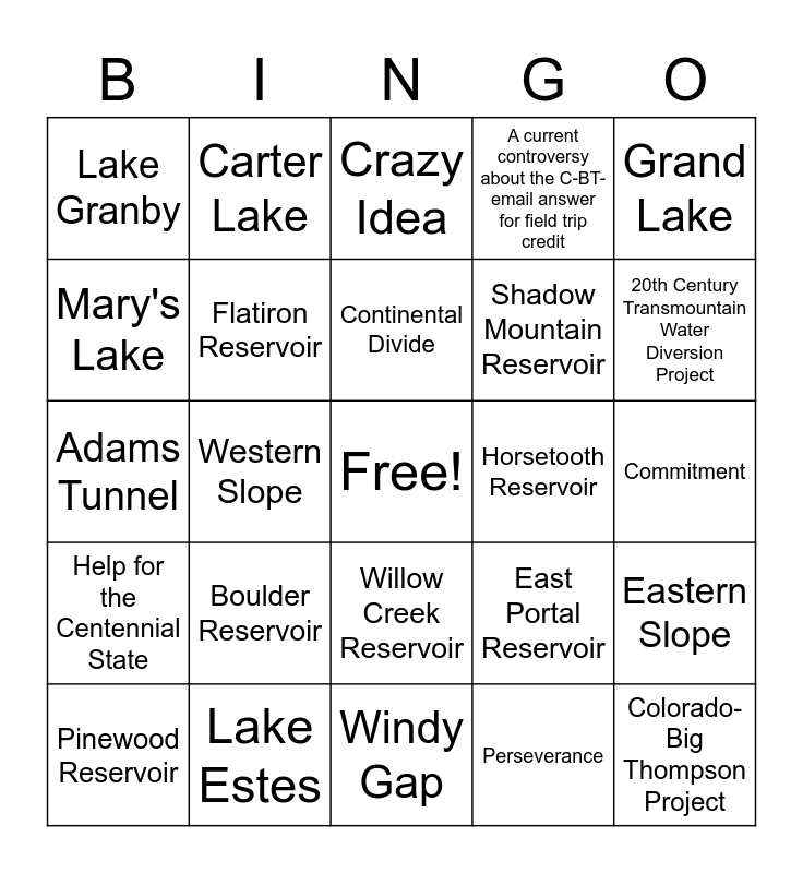 This bingo card has a free space and 24 words: Boulder Reservoir, Lake Estes, Continental Divide, Pinewood Reservoir, Grand Lake, Lake Granby, Mary's Lake, Carter Lake, Horsetooth Reservoir, Willow Creek Reservoir, Shadow Mountain Reservoir, Adams Tunnel, East Portal Reservoir, Eastern Slope, Flatiron Reservoir, Perseverance, Commitment, Crazy Idea, 20th Century Transmountain Water Diversion Project, Western Slope, Colorado-Big Thompson Project, Help for the Centennial State, A current controversy about the C-BT-email answer for field trip credit and Windy Gap.