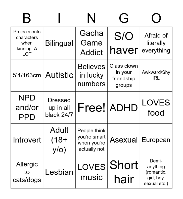 This bingo card has a free space and 24 words: Adult (18+ y/o), Lesbian, Believes in lucky numbers, Allergic to cats/dogs, Afraid of literally everything, Projects onto characters when kinning. A LOT, 5'4/163cm, Bilingual, ADHD, People think you're smart when you're actually not, Class clown in your friendship groups, NPD and/or PPD, Asexual, European, Autistic, Short hair, LOVES food, Gacha Game Addict, Awkward/Shy IRL, Dressed up in all black 24/7, Demi-anything (romantic, girl, boy, sexual etc.), Introvert, S/O haver and LOVES music.