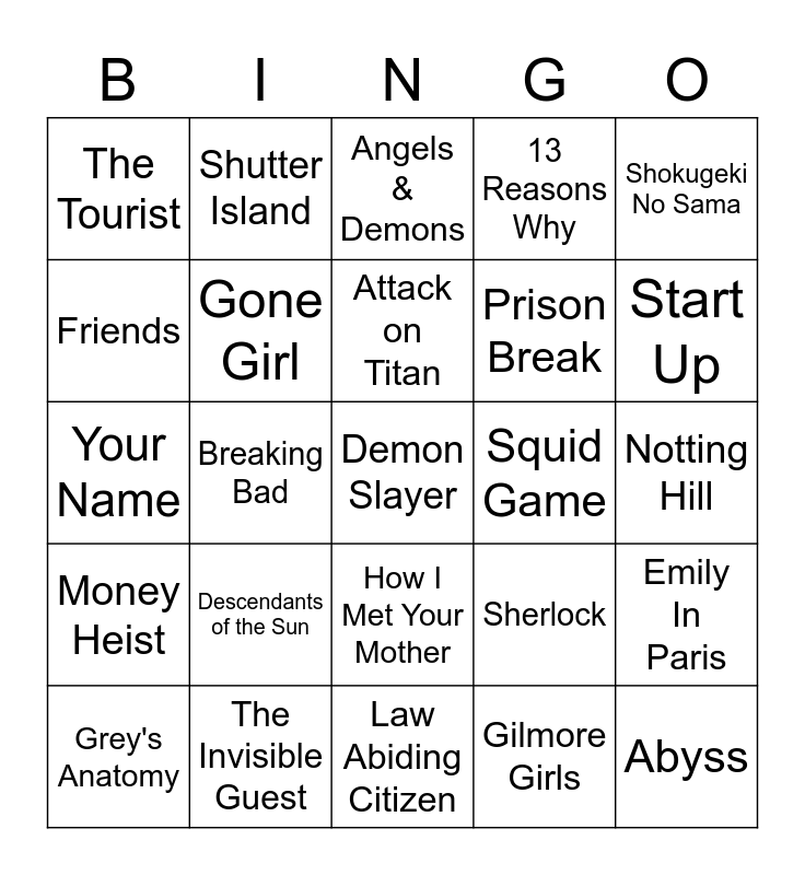 This bingo card has a free space and 24 words: Descendants of the Sun, The Invisible Guest, Attack on Titan, Grey's Anatomy, Shokugeki No Sama, The Tourist, Friends, Shutter Island, Squid Game, How I Met Your Mother, Prison Break, Your Name, Sherlock, Emily In Paris, Gone Girl, Gilmore Girls, Notting Hill, Angels & Demons, Start Up, Breaking Bad, Abyss, Money Heist, 13 Reasons Why and Law Abiding Citizen.
