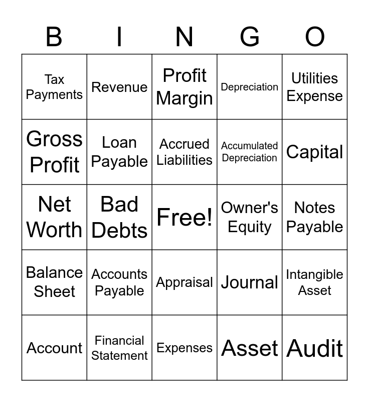 This bingo card has a free space and 24 words: Account, Accounts Payable, Accrued Liabilities, Asset, Utilities Expense, Tax Payments, Revenue, Profit Margin, Owner's Equity, Notes Payable, Net Worth, Loan Payable, Journal, Intangible Asset, Gross Profit, Financial Statement, Expenses, Depreciation, Capital, Balance Sheet, Bad Debts, Appraisal, Accumulated Depreciation and Audit.