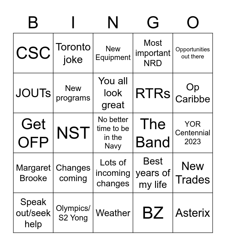 This bingo card has 52 words: Free!, No better time to be in the Navy, Family, Weather, Changes coming, You are face of Navy, Toronto joke, When I first joined..., JOUTs, I will keep this short, New programs, Recruits, New Trades, Best years of my life, Guests and alumni, Get out and deploy, You all look great, The Band, MCDVs, Opportunities out there, NST, BZ, CSC, RTRs, OP LENTUS, Asterix, Budget, Arctic, Op Caribbe, Joke about our CO, Traditions, Most important NRD, Biggest NRD, New Uniforms, New Ships, New Equipment, Olympics/ S2 Yong, Resiliency, To the folks watching from home, To the folks unable to attend, Harry DeWolf, YOR Centennial 2023, Margaret Brooke, Lots of new faces, Lots of incoming changes, Barrie Det, NRETs, Get OFP, OP Laser, Watch out for your wingers, Speak out/seek help and Always keep your CoC informed.