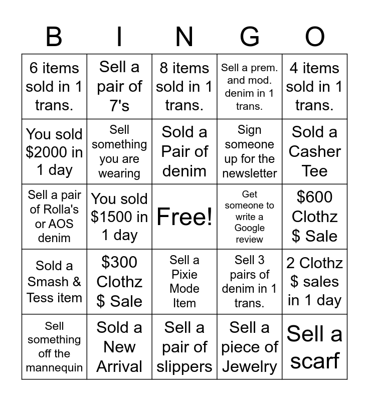 This bingo card has a free space and 24 words: $300 Clothz $ Sale, Sold a New Arrival, Sold a Pair of denim, Sell something off the mannequin, 4 items sold in 1 trans., 6 items sold in 1 trans., You sold $2000 in 1 day, Sell a pair of 7's, Get someone to write a Google review, Sell a Pixie Mode Item, Sign someone up for the newsletter, Sell a pair of Rolla's or AOS denim, Sell 3 pairs of denim in 1 trans., 2 Clothz $ sales in 1 day, Sell something you are wearing, Sell a piece of Jewelry, $600 Clothz $ Sale, 8 items sold in 1 trans., Sold a Casher Tee, You sold $1500 in 1 day, Sell a scarf, Sold a Smash & Tess item, Sell a prem. and mod. denim in 1 trans. and Sell a pair of slippers.