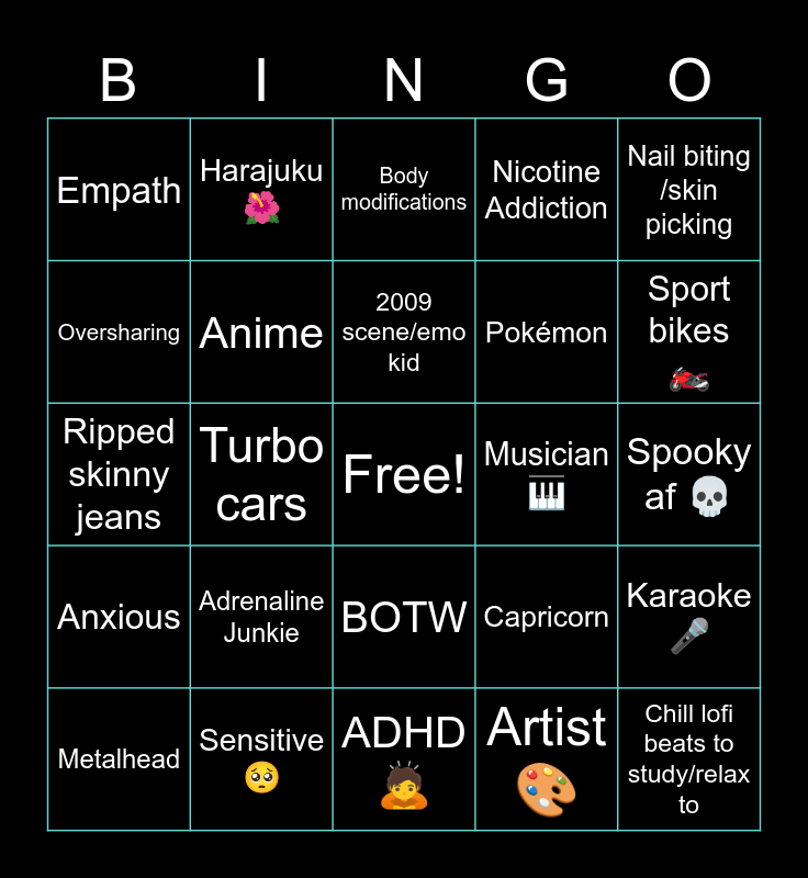 This bingo card has a free space and 24 words: Adrenaline Junkie, Sensitive ๐ฅบ, 2009 scene/emo kid, Metalhead, Nail biting /skin picking, Empath, Oversharing, Harajuku ๐บ, Musician ๐น, BOTW, Pokรฉmon, Ripped skinny jeans, Capricorn, Karaoke ๐ค, Anime, Artist ๐จ, Spooky af ๐, Body modifications, Sport bikes ๐๏ธ, Turbo cars, Chill lofi beats to study/relax to, Anxious, Nicotine Addiction and ADHD ๐.