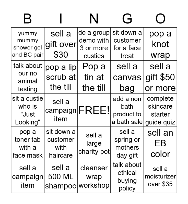 This bingo card has a free space and 24 words: sit down a customer with haircare, sell a 500 ML shampoo, Pop a tin at the till, sell a campaign item, pop a knot wrap, yummy mummy shower gel and BC pair, talk about our no animal testing, sell a gift over $30, add a non bath product to a bath sale, sell a large charity pot, sell a canvas bag, sit a custie who is "Just Looking", sell a spring or mothers day gift, sell an EB color, pop a lip scrub at the till, talk about ethical buying policy, complete skincare starter guide quiz, do a group demo with 3 or more custies, sell a gift $50 or more, sell a campaign item, sell a moisturizer over $35, pop a toner tab with a face mask, sit down a customer for a face treat and cleanser wrap workshop.