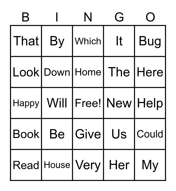 This bingo card has a free space and 114 words: Way, I, How, Were, Did, Put, It, Cat, Bed, The, A, To, Go, Is, Have, They, Give, Been, Girl, Boy, Read, Which, This, Very, Dog, Book, House, Under, About, Them, Here, Home, Will, For, Is, One, Good, Just, Him, And, Me, So, We, Happy, Take, Can, Her, Look, Found, There, Our, New, Car, With, What, Play, Do, Sleep, Hat, Your, Could, Just, Want, We, Not, From, At, Down, Happy, Her, Help, Little, Who, Work, Like, My, Be, That, Red, And, In, By, See, Us, The, Box, Tree, Find, Run, Are, Way, On, Come, Bug, You, Will, School, Red, With, Get, Make, He, She, Saw, Seen, Just, We, Very, Was, Many, About, Big, Would and Could.