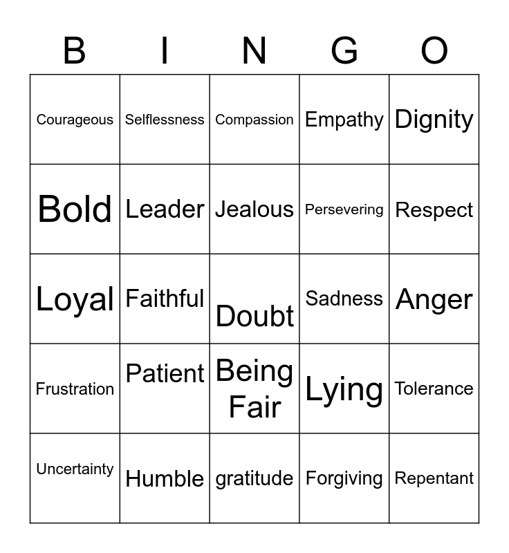 This bingo card has a free space and 24 words: Patient, Humble, Jealous, Uncertainty, Dignity, Courageous, Bold, Selflessness, Sadness, Being Fair, Persevering, Loyal, Lying, Tolerance, Leader, Forgiving, Anger, Compassion, Respect, Faithful, Repentant, Frustration, Empathy and gratitude.