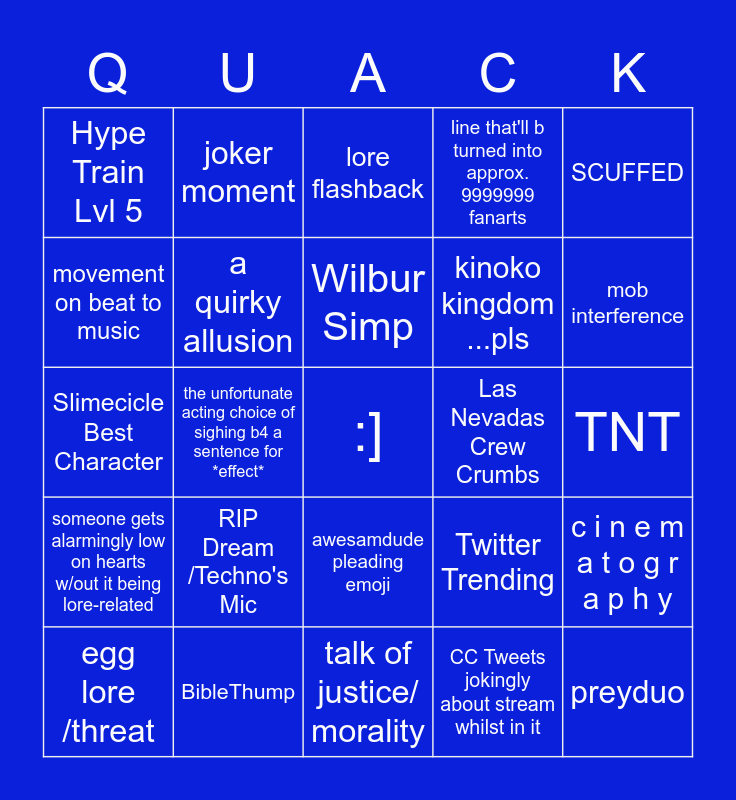 This bingo card has a free space and 24 words: RIP Dream /Techno's Mic, BibleThump, Wilbur Simp, egg lore /threat, SCUFFED, Hype Train Lvl 5, movement on beat to music, joker moment, Las Nevadas Crew Crumbs, awesamdude pleading emoji, kinoko kingdom ...pls, Slimecicle Best Character, Twitter Trending, c i n e m a t o g r a p h y, a quirky allusion, CC Tweets jokingly about stream whilst in it, TNT, lore flashback, mob interference, the unfortunate acting choice of sighing b4 a sentence for *effect*, preyduo, someone gets alarmingly low on hearts w/out it being lore-related, line that'll b turned into approx. 9999999 fanarts and talk of justice/ morality.