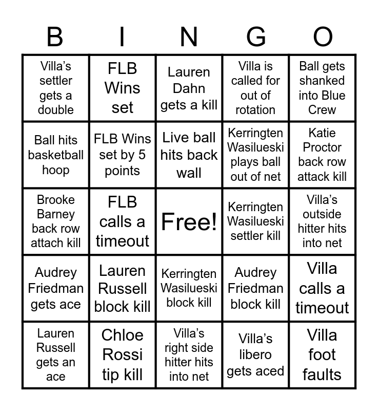 This bingo card has a free space and 34 words: Lauren Dahn gets pancake, Villa’s libero gets aced, Kerringten Wasilueskigets kill, Lauren Dahn gets roll shot kill, Audrey Friedman gets ace, FLB Wins set by 5 points, Ball gets shanked into Blue Crew, Lauren Russell gets an ace, FLB Wins set, Coach Johsnon drinks coffee, Live ball hits back wall, Lauren Dahn gets a kill, Audrey Friedman kill, Laren Barnett kill, Kerringten Wasilueski settler kill, Katie Proctor back row attack kill, Chloe Rossi tip kill, Brooke Barney back row attach kill, Lauren Russell block kill, Audrey Friedman block kill, Kerringten Wasilueski block kill, Villa service miss, Villa’s settler gets a double, Villa’s outside hitter hits into net, Villa’s right side hitter hits into net, Villa foot faults, Villa is called for out of rotation, Ball hits ceiling during play, Kerringten Wasilueski plays ball out of net, Ball hits basketball hoop, Destiny Reigel gets an ace, FLB calls a timeout, Villa calls a timeout and Ball hits bleachers while in play.