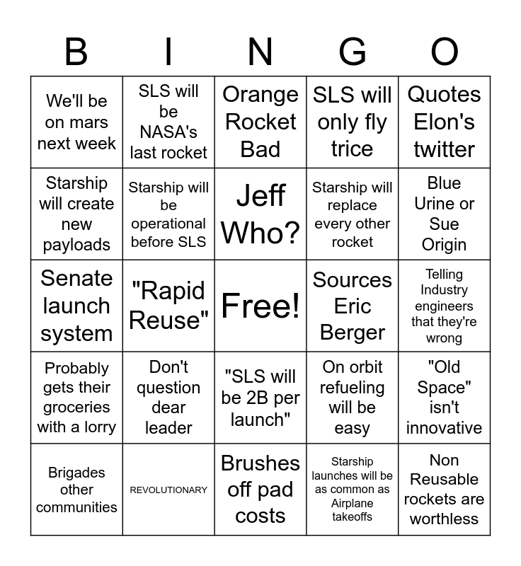 This bingo card has a free space and 24 words: Don't question dear leader, REVOLUTIONARY, Jeff Who?, Brigades other communities, Quotes Elon's twitter, We'll be on mars next week, Starship will create new payloads, SLS will be NASA's last rocket, Sources Eric Berger, "SLS will be 2B per launch", Starship will replace every other rocket, Senate launch system, On orbit refueling will be easy, "Old Space" isn't innovative, Starship will be operational before SLS, Starship launches will be as common as Airplane takeoffs, Telling Industry engineers that they're wrong, Orange Rocket Bad, Blue Urine or Sue Origin, "Rapid Reuse", Non Reusable rockets are worthless, Probably gets their groceries with a lorry, SLS will only fly trice and Brushes off pad costs.