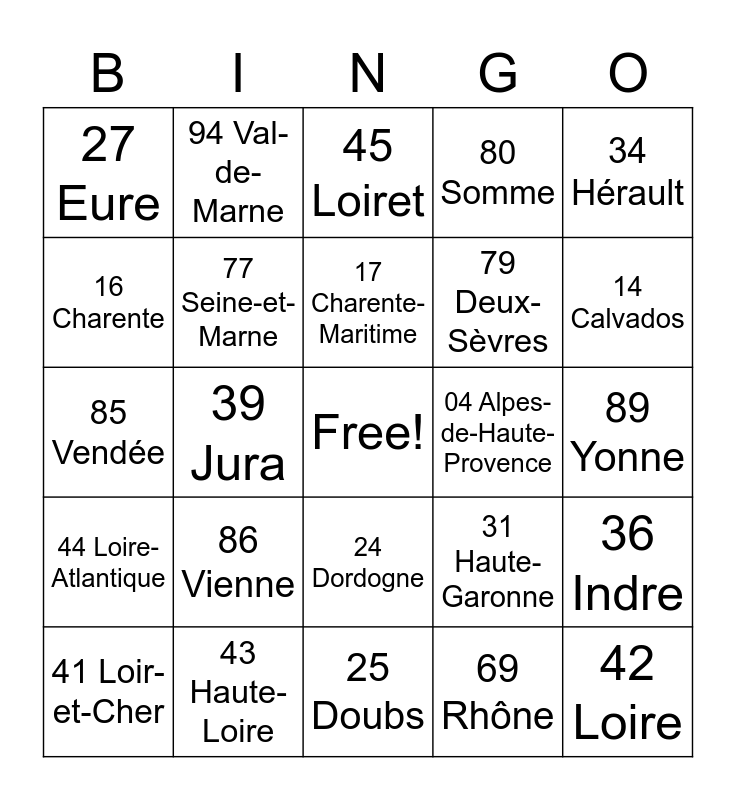 This bingo card has a free space and 96 words: 01 Ain, 02 Aisne, 03 Allier, 04 Alpes-de-Haute-Provence, 05 Hautes-Alpes, 06 Alpes-Maritimes, 07 Ardèche, 08 Ardennes, 09 Ariège, 10 Aube, 11 Aude, 12 Aveyron, 13 Bouches-du-Rhône, 14 Calvados, 15 Cantal, 16 Charente, 17 Charente-Maritime, 18 Cher, 19 Corrèze, 2A Corse-du-Sud (Ajaccio), 2B Corse-Haute (Bastia), 21 Côte d'Or, 22 Côtes d'Armor, 23 Creuse, 24 Dordogne, 25 Doubs, 26 Drôme, 27 Eure, 28 Eure-et-Loir, 29 Finistère, 30 Gard, 31 Haute-Garonne, 32 Gers, 33 Gironde, 34 Hérault, 35 Ille-et-Vilaine, 36 Indre, 37 Indre-et-Loire, 38 Isère, 39 Jura, 40 Landes, 41 Loir-et-Cher, 42 Loire, 43 Haute-Loire, 44 Loire-Atlantique, 45 Loiret, 46 Lot, 47 Lot-et-Garonne, 48 Lozère, 49 Maine-et-Loire, 50 Manche, 51 Marne, 52 Haute-Marne, 53 Mayenne, 54 Moselle, 55 Meuse, 56 Morbihan, 57 Meurthe-et-Moselle, 58 Nièvre, 59 Nord, 60 Oise, 61 Orne, 62 Pas-de-Calais, 63 Puy-de-Dôme, 64 Pyrénées-Atlantiques, 65 Hautes-Pyrénées, 66 Pyrénées Orientales, 67 Bas-Rhin, 68 Haut-Rhin, 69 Rhône, 70 Haute-Saône, 71 Saône-et-Loire, 72 Sarthe, 73 Savoie, 74 Haute-Savoie, 75 Paris, 76 Seine-Maritime, 77 Seine-et-Marne, 78 Yvelines, 79 Deux-Sèvres, 80 Somme, 81 Tarn, 82 Tarn-et-Garonne, 83 Var, 84 Vaucluse, 85 Vendée, 86 Vienne, 87 Haute-Vienne, 88 Vosges, 89 Yonne, 90 Territoire de Belfort, 91 Essonne, 92 Hauts-de-Seine, 93 Seine-Saint-Denis, 94 Val-de-Marne and 95 Val-d'Oise.