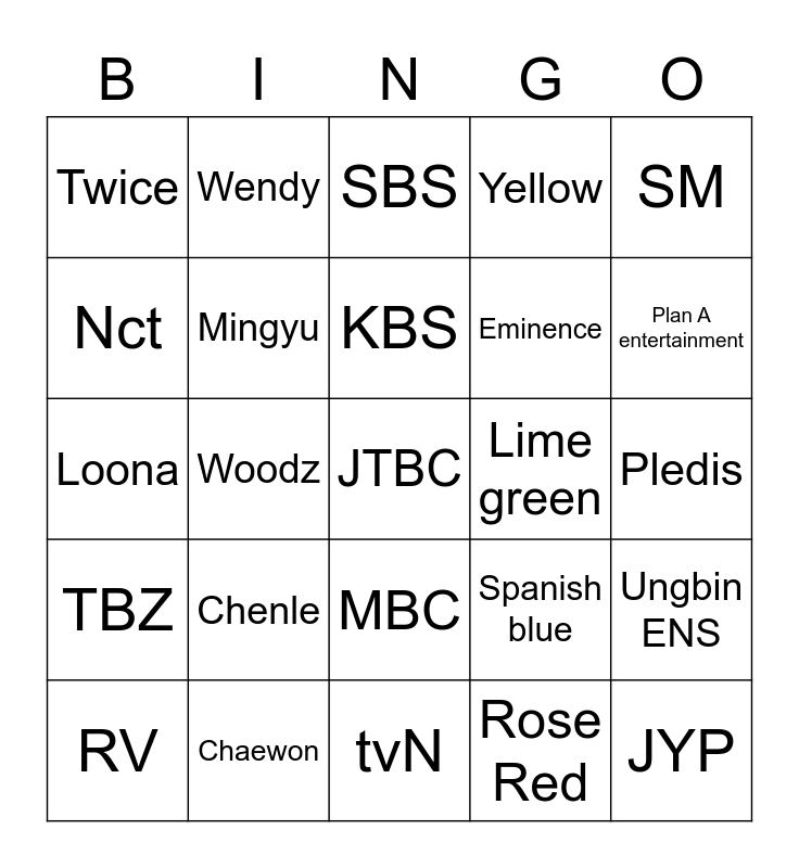 This bingo card has a free space and 24 words: RV, Chenle, KBS, Rose Red, SM, Twice, Wendy, SBS, Lime green, Pledis, Loona, Mingyu, Spanish blue, Ungbin ENS, Nct, Chaewon, tvN, Yellow, Plan A entertainment, TBZ, Woodz, MBC, Eminence and JYP.