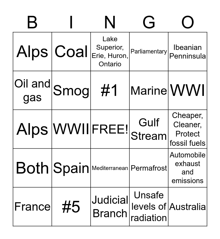 This bingo card has a free space and 24 words: Spain, #5, #1, France, Ibeanian Penninsula, Alps, Oil and gas, Coal, Gulf Stream, Mediterranean, Marine, Alps, Permafrost, Automobile exhaust and emissions, Smog, Unsafe levels of radiation, Cheaper, Cleaner, Protect fossil fuels, Lake Superior, Erie, Huron, Ontario, WWI, WWII, Australia, Both, Parliamentary and Judicial Branch.