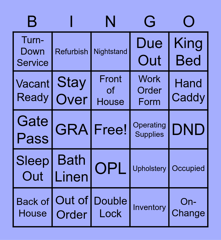This bingo card has a free space and 24 words: Back of House, Bath Linen, Front of House, Inventory, King Bed, Turn- Down Service, Refurbish, Nightstand, Operating Supplies, DND, Gate Pass, Stay Over, Upholstery, Occupied, Vacant Ready, Out of Order, Double Lock, Due Out, Hand Caddy, Sleep Out, GRA, OPL, Work Order Form and On-Change.
