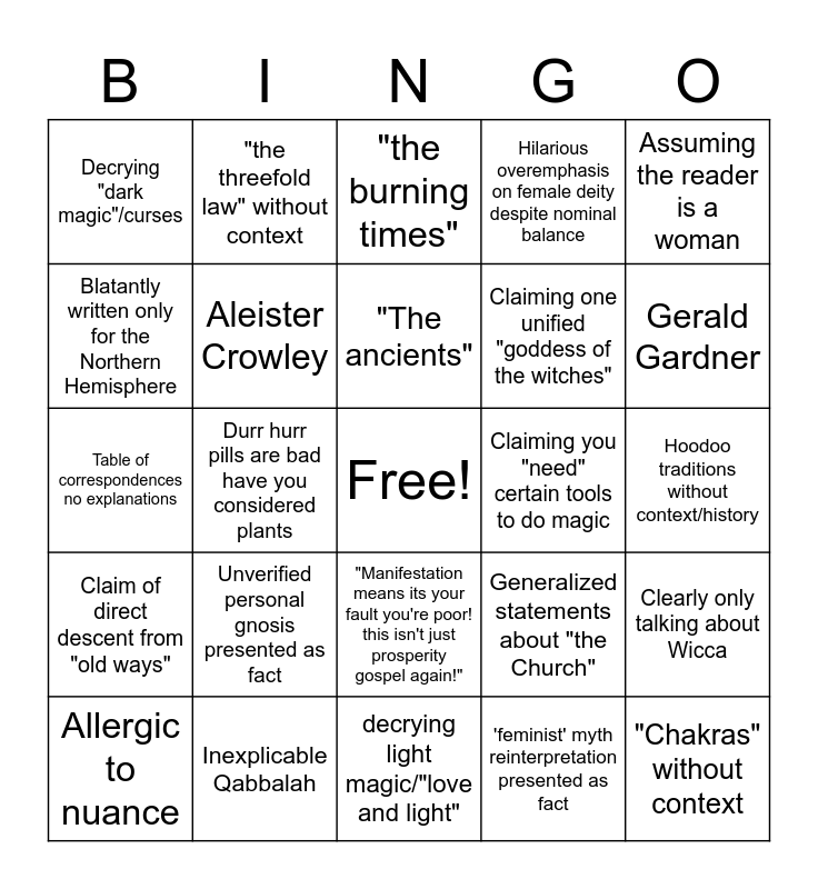 This bingo card has a free space and 24 words: Unverified personal gnosis presented as fact, Inexplicable Qabbalah, "The ancients", Allergic to nuance, Assuming the reader is a woman, Decrying "dark magic"/curses, Blatantly written only for the Northern Hemisphere, "the threefold law" without context, Claiming you "need" certain tools to do magic, "Manifestation means its your fault you're poor! this isn't just prosperity gospel again!", Claiming one unified "goddess of the witches", Table of correspondences no explanations, Generalized statements about "the Church", Clearly only talking about Wicca, Aleister Crowley, 'feminist' myth reinterpretation presented as fact, Hoodoo traditions without context/history, "the burning times", Gerald Gardner, Durr hurr pills are bad have you considered plants, "Chakras" without context, Claim of direct descent from "old ways", Hilarious overemphasis on female deity despite nominal balance and decrying light magic/"love and light".