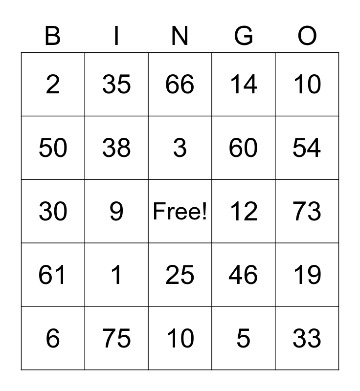 This bingo card has a free space and 24 words: 1, 75, 3, 6, 10, 2, 50, 35, 12, 25, 60, 30, 46, 19, 38, 5, 73, 66, 54, 9, 33, 61, 14 and 10.