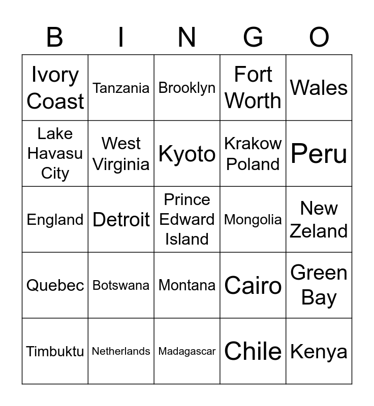 This bingo card has 35 words: Guatemala, Iceland, Australia, West Virginia, Montana, Fort Worth, Lake Havasu City, St Petersberg, Kyoto, Amarillo, England, Wales, Utah, Ireland, Ivory Coast, Mongolia, Chile, Detroit, Quebec, Prince Edward Island, Cairo, Timbuktu, Green Bay, Netherlands, Brooklyn, Peru, Kenya, Romania, Krakow Poland, New Zeland, South Africa, Madagascar, Botswana, Tanzania and Chad.