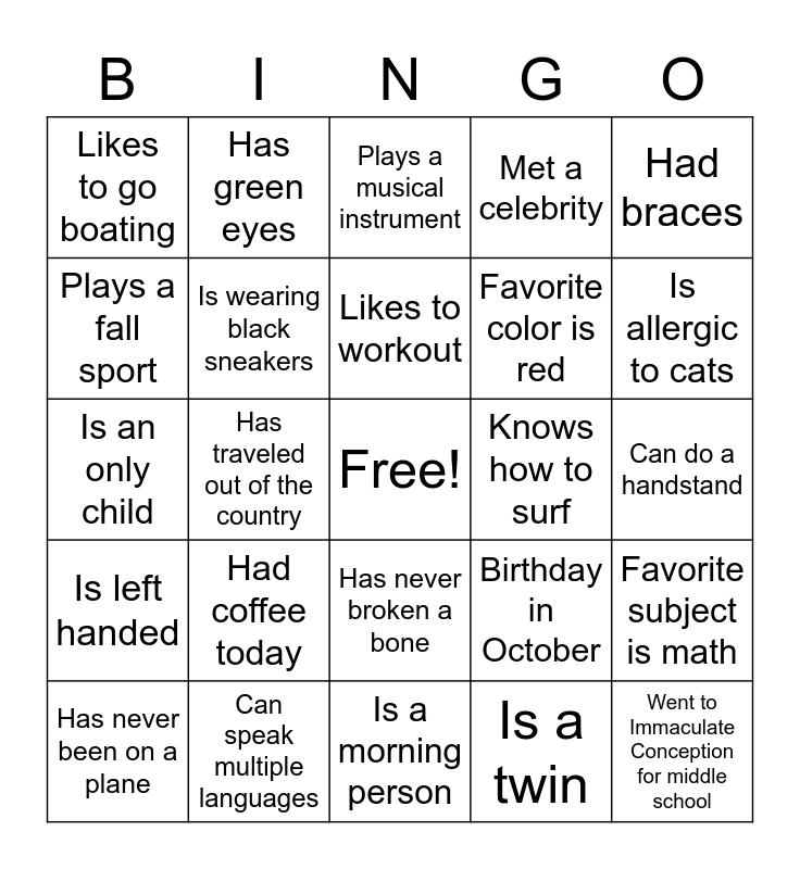 This bingo card has a free space and 24 words: Had coffee today, Can speak multiple languages, Likes to workout, Has never been on a plane, Had braces, Likes to go boating, Plays a fall sport, Has green eyes, Knows how to surf, Has never broken a bone, Favorite color is red, Is an only child, Birthday in October, Favorite subject is math, Is wearing black sneakers, Is a twin, Can do a handstand, Plays a musical instrument, Is allergic to cats, Has traveled out of the country, Went to Immaculate Conception for middle school, Is left handed, Met a celebrity and Is a morning person.
