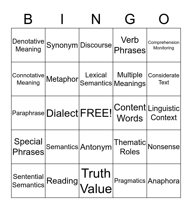 This bingo card has a free space and 24 words: Semantics, Reading, Lexical Semantics, Sentential Semantics, Comprehension Monitoring, Denotative Meaning, Connotative Meaning, Synonym, Content Words, Antonym, Multiple Meanings, Paraphrase, Thematic Roles, Nonsense, Metaphor, Pragmatics, Linguistic Context, Discourse, Considerate Text, Dialect, Anaphora, Special Phrases, Verb Phrases and Truth Value.